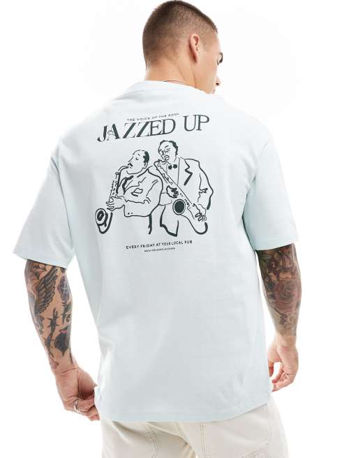 Camiseta azul extragrande con estampado "Jazzed Up" en la espalda de Selected Homme