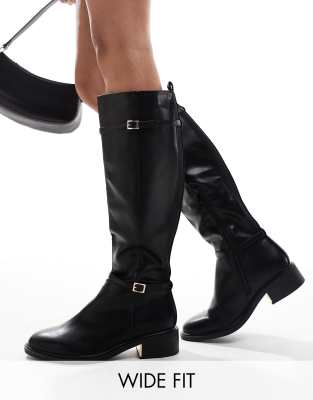 Botas de montar por la rodilla negras planas de SEQWL Wide Fit