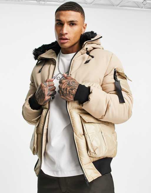 Chaqueta acolchada beis con capucha de piel sintética Distance de SikSilk