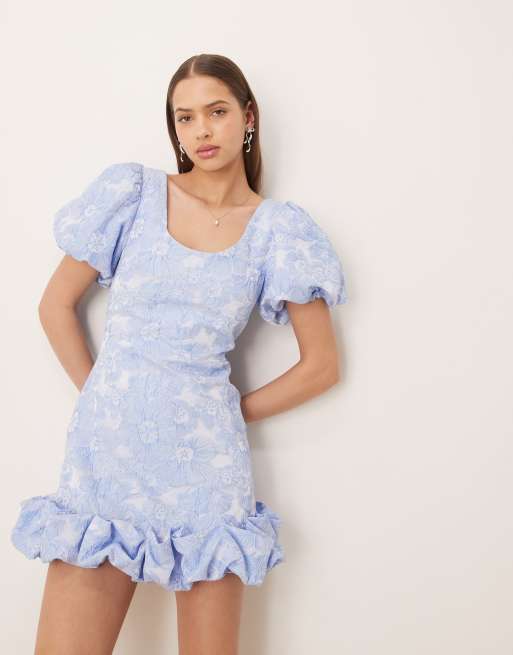 Vestido corto azul pastel con patrón floral y bajo abullonado de jacquard de Sister Jane