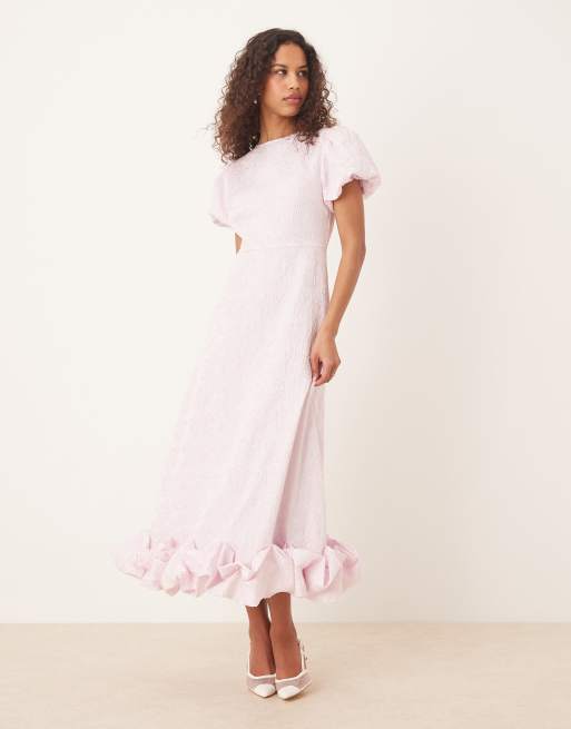 Vestido largo lila lavanda con estampado floral, mangas abullonadas y bajo abullonado de Sister Jane