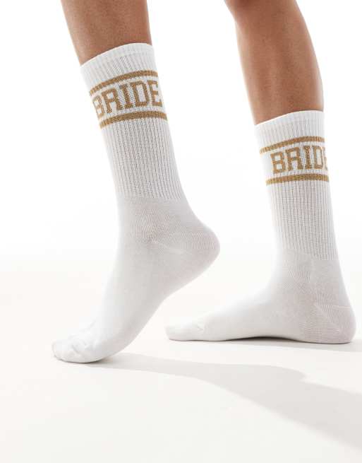 Calcetines blancos y dorados con estampado "Bride" de Six Stories