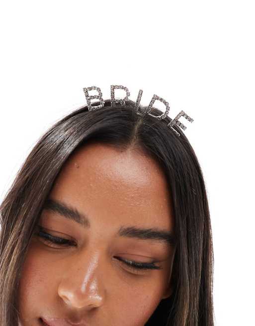 Diadema de novia plateada con texto "Bride" de strass de Six Stories