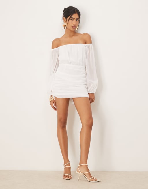 Vestido corto blanco de manga larga con escote Bardot y detalle fruncido de malla de SNDYS