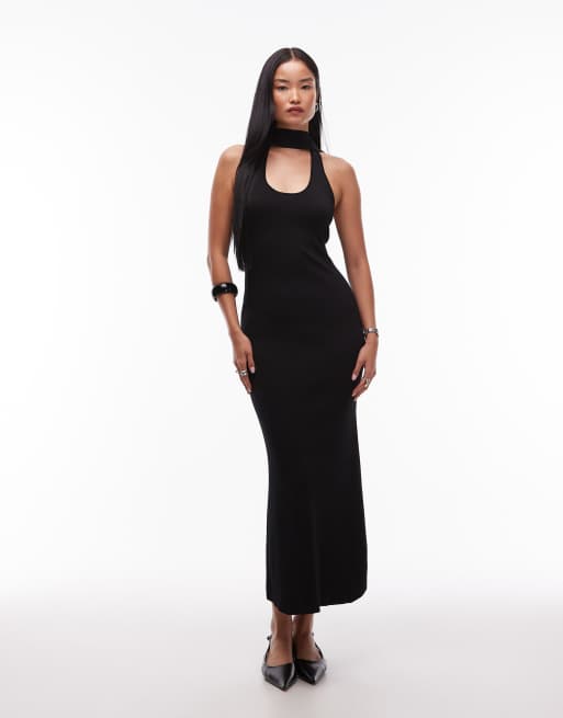 Vestido largo negro de corte sirena con cuello ancho y detalle de fular de punto acanalado premium de SNDYS