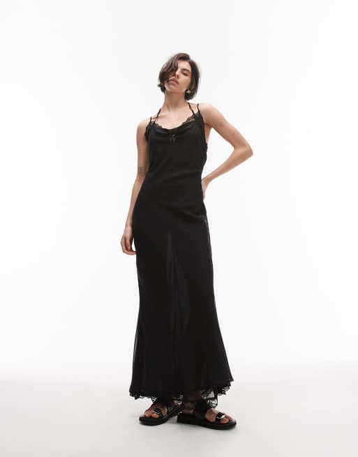 Vestido largo negro de tirantes con cuello desbocado y ribete de encaje de SNDYS