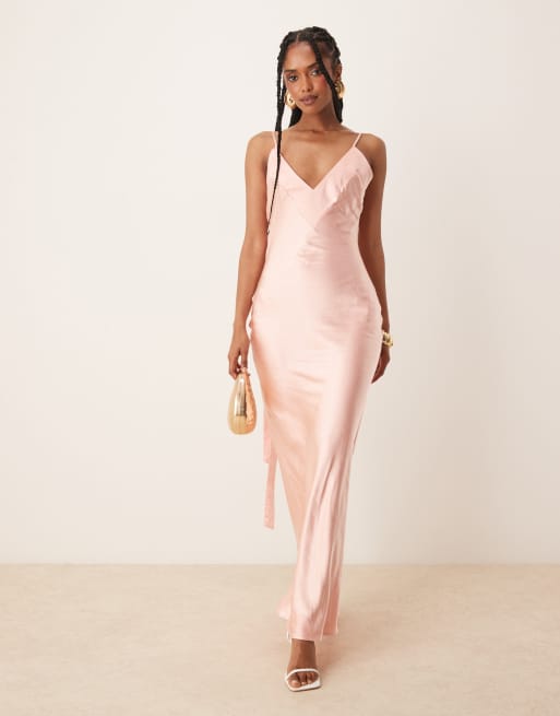 Vestido largo rosa con cuello de pico y detalle de lazada en la espalda de satén exclusivo de SNDYS