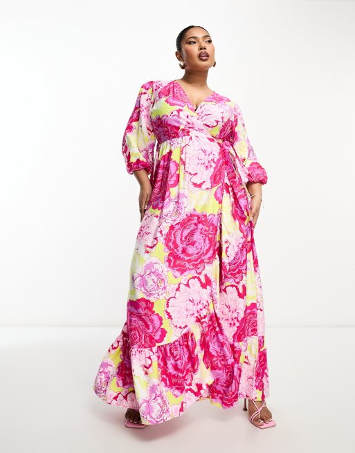 Vestido largo cruzado con estampado de rosas en tonos neón de Something New Curve