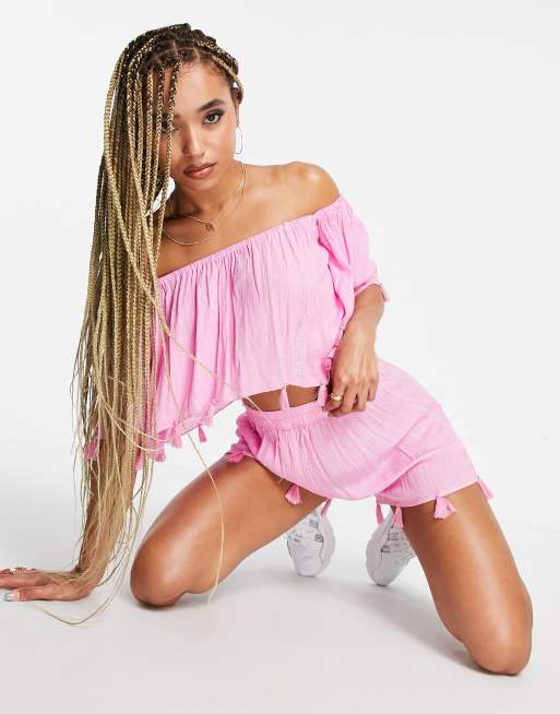 Set de top palabra de honor y pantalones cortos con borlas, rayas de purpurina y acabado arrugado de South Beach
