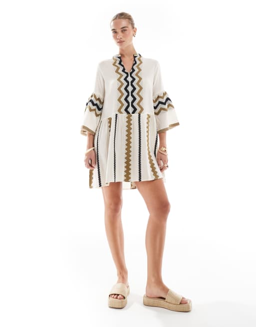 Vestido corto caqui escalonado con bajo caído y patrón de jacquard de South Beach