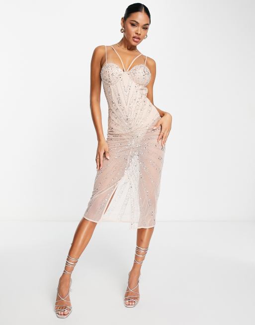 Vestido midi plateado con adornos y tejido transparente en contraste de Starlet