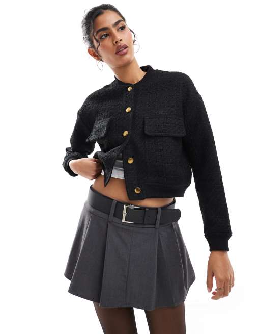 Chaqueta bomber negra abotonada de bouclé texturizado de Style Cheat