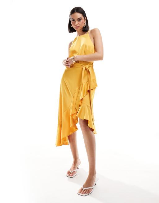 Vestido midi amarillo caléndula con cuello halter y volantes de Style Cheat