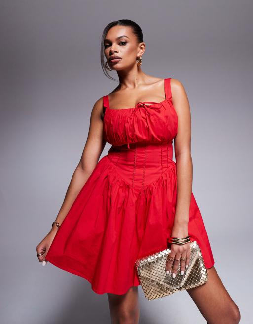 Vestido corto rojo de copas grandes con diseño fruncido estilo corsé y ribete de encaje Camille de Taideux