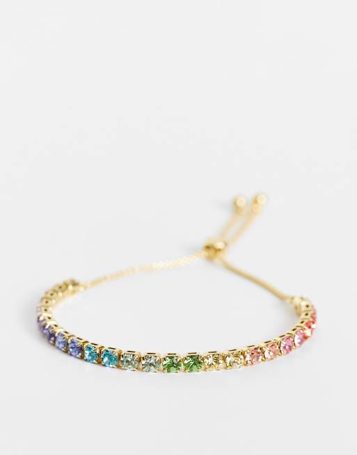 Pulsera dorada con cristales en tonos arcoíris, cierre ajustable y logo Melrah de Ted Baker
