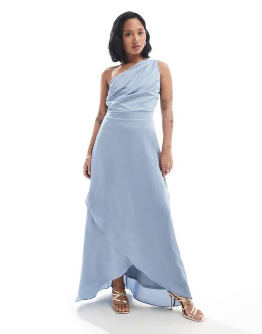 Vestido de dama de honor largo azul empolvado asimétrico con falda cruzada de satén de TFNC Petite