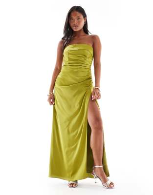 Vestido de dama de honor largo verde oliva con escote palabra de honor y lazada en la espalda de satén de TFNC Petite