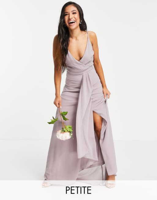Vestido largo gris claro de dama de honor de tirantes con diseño cruzado y corte sirena de TFNC Petite