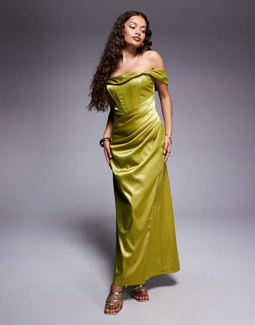 Vestido largo verde oliva con hombros caídos y diseño estilo corsé de satén de TFNC Petite