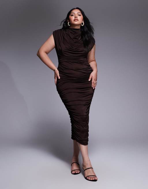 Vestido midi marrón chocolate de cuello alto de TFNC Plus