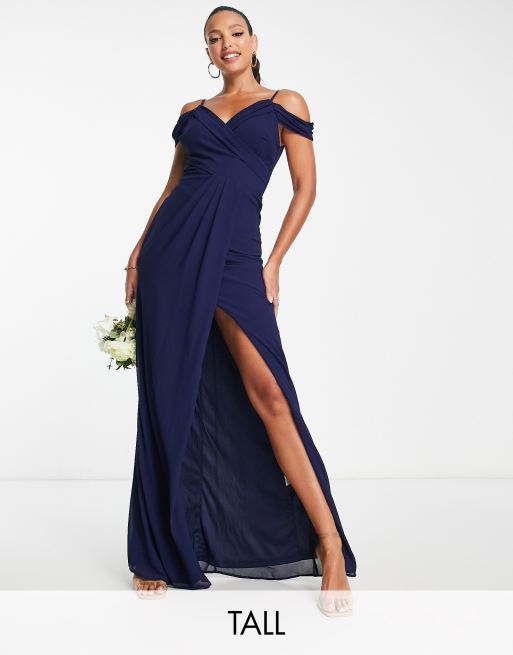 Vestido de dama de honor azul marino cruzado con hombros drapeados de TFNC Tall