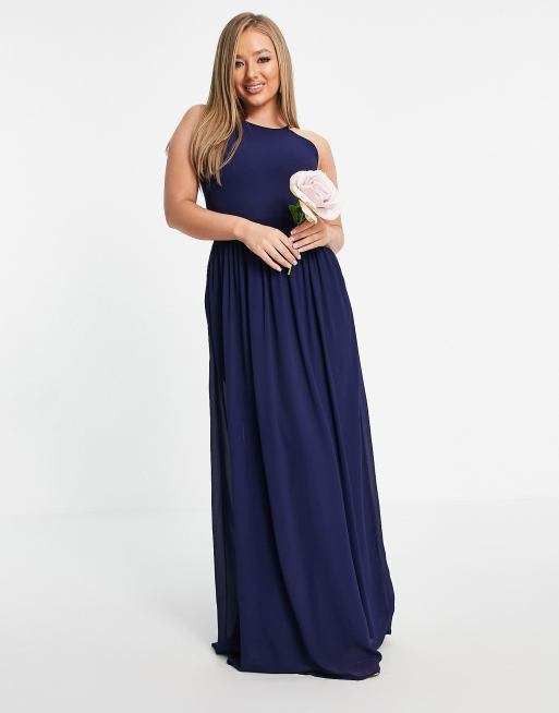 Vestido de dama de honor largo azul marino plisado con cuello alzado de TFNC