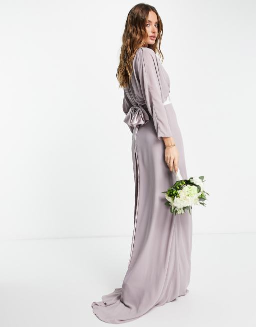 Vestido de dama de honor largo gris lavanda de manga larga con lazada en la espalda de TFNC