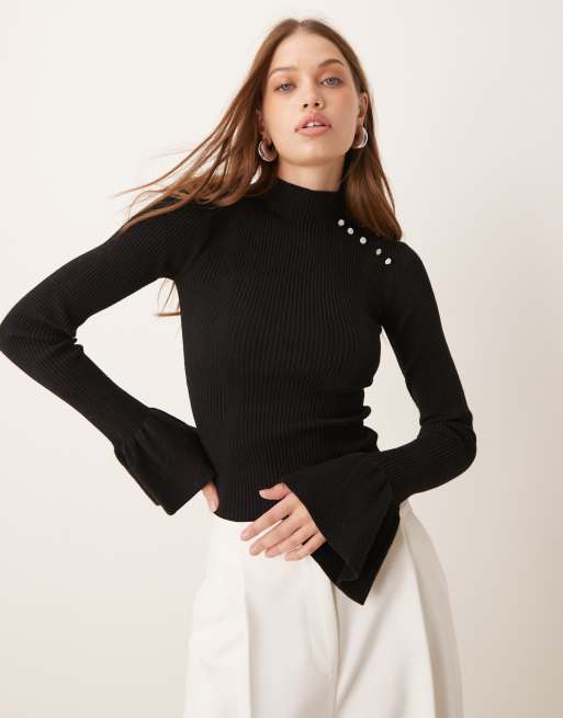 Jersey negro de canalé con mangas acampanadas y detalle de perlas exclusivo de The Frolic