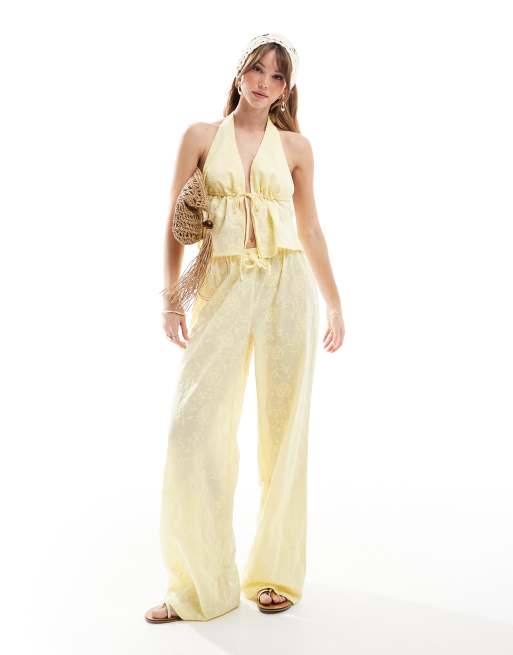 Pantalones playeros amarillo pastel de pernera recta con lazada en la cintura y diseño bordado exclusivos de The Frolic (parte de un conjunto)