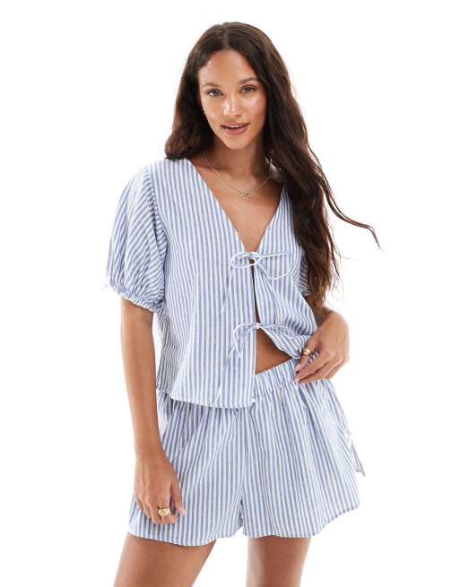 Top de pijama a rayas blancas y azules con mangas abullonadas y lazadas delanteras exclusivo de The Frolic (parte de un conjunto)