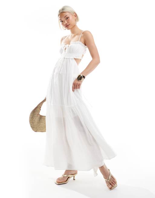 Vestido largo blanco escalonado con espalda descubierta, lazada delantera y ribetes de volantes exclusivo de The Frolic