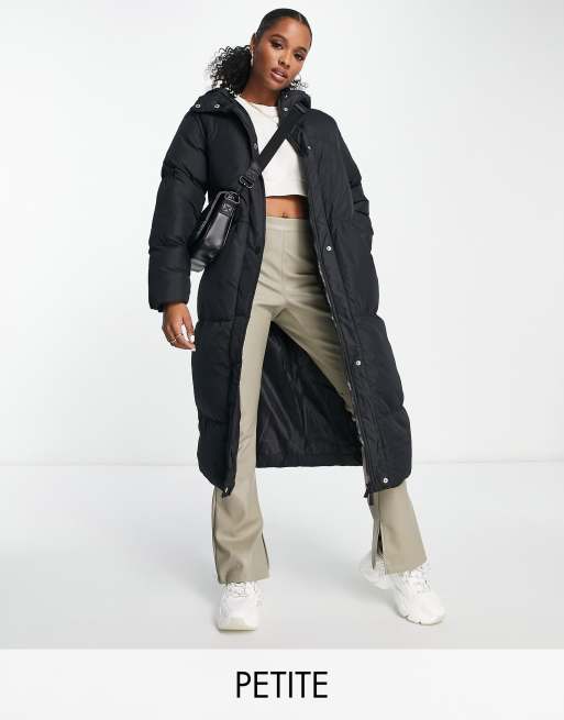 Abrigo de plumas largo negro con capucha Jodie de Threadbare Petite