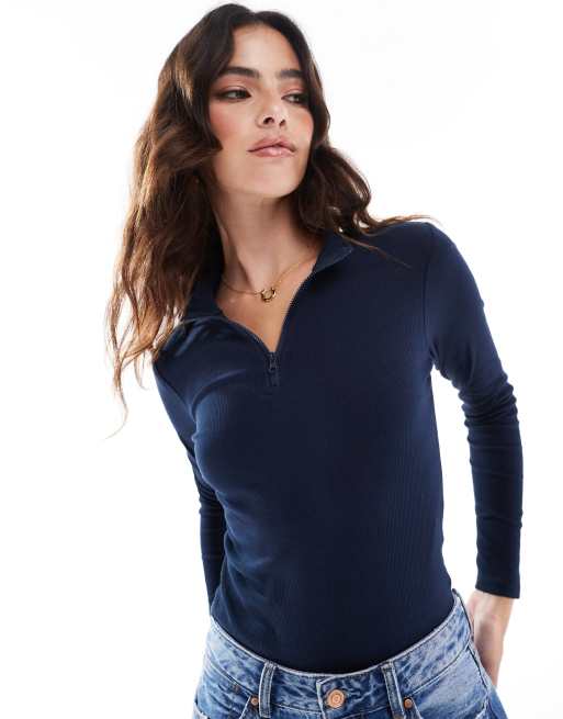 Body azul marino de manga larga con cuello subido y media cremallera de canalé de Threadbare