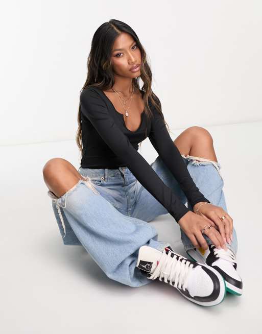 Body negro de manga larga con muesca en el escote de tejido superelástico de Threadbare