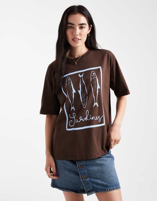 Camiseta marrón chocolate de manga corta con estampado gráfico y texto "Sardines" de algodón de Threadbare