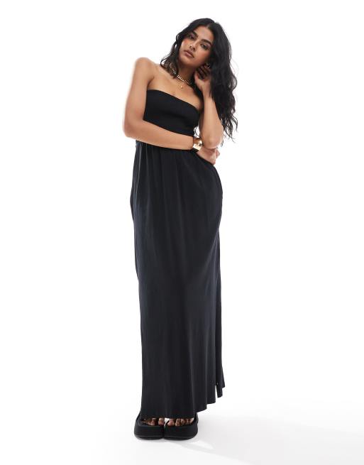 Vestido largo negro con escote palabra de honor de punto liso de Threadbare