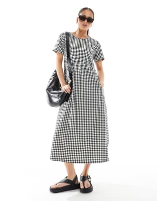 Vestido midi a cuadros vichy negros y blancos de manga corta con bolsillos de punto liso de Threadbare