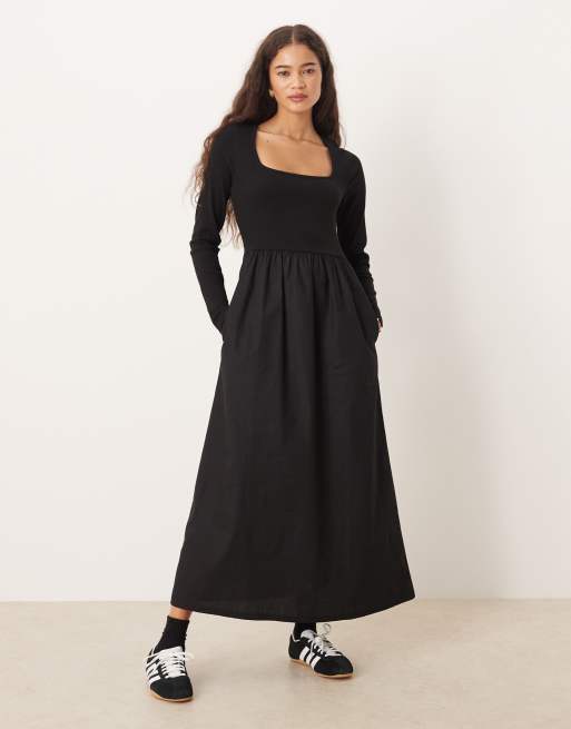 Vestido midi negro de manga larga con cuello cuadrado y falda de popelina de Threadbare