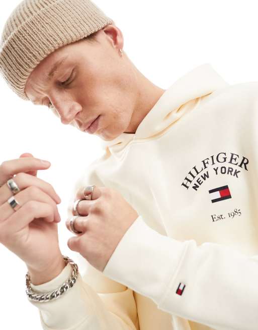 Sudadera crema con capucha y diseño universitario arqueado de Tommy Hilfiger