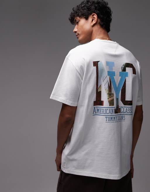 Camiseta blanca con estampado en la espalda de texto "NYC" con fondo fotográfico de Tommy Jeans