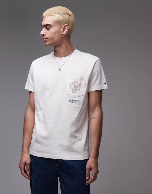 Camiseta blanco hueso con bolsillo y estampado del logo con remolinos en la espalda de Tommy Jeans