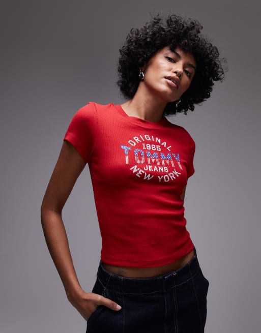 Camiseta roja con logo con motivo de Estados Unidos en la parte central del pecho de Tommy Jeans