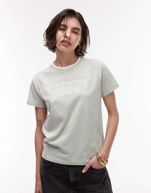 Camiseta verde salvia con logo grande bordado de Tommy Jeans