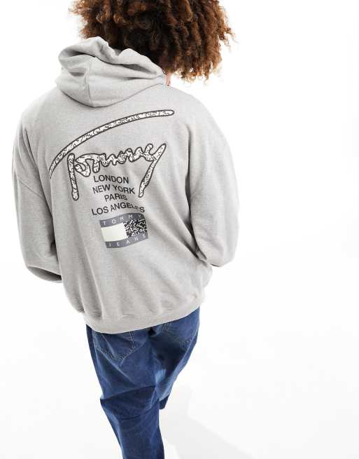 Sudadera gris extragrande con capucha y estampado trasero de Tommy Jeans