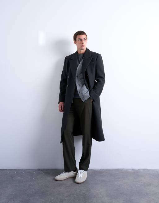 Abrigo gris carbón con doble botonadura y cintura entallada de mezcla de lana de Topman