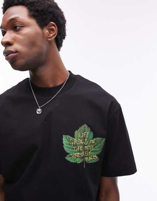 Camiseta negra extragrande con bordado de hoja y texto de Topman