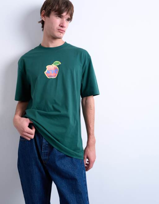 Camiseta verde oscuro holgada con estampado de manzana y texto "NYC" de Topman