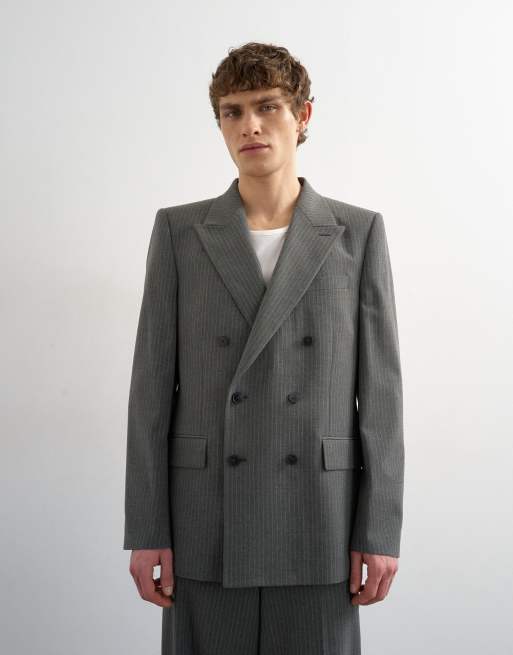Chaqueta de traje gris carbón holgada con raya diplomática y doble botonadura de Topman