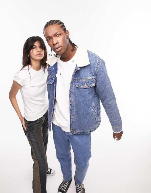 Chaqueta vaquera con lavado azul medio y cuello de borreguito de Topman