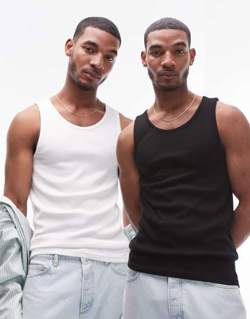 Pack de 2 camisetas de color blanco y negro sin mangas de canalé de Topman
